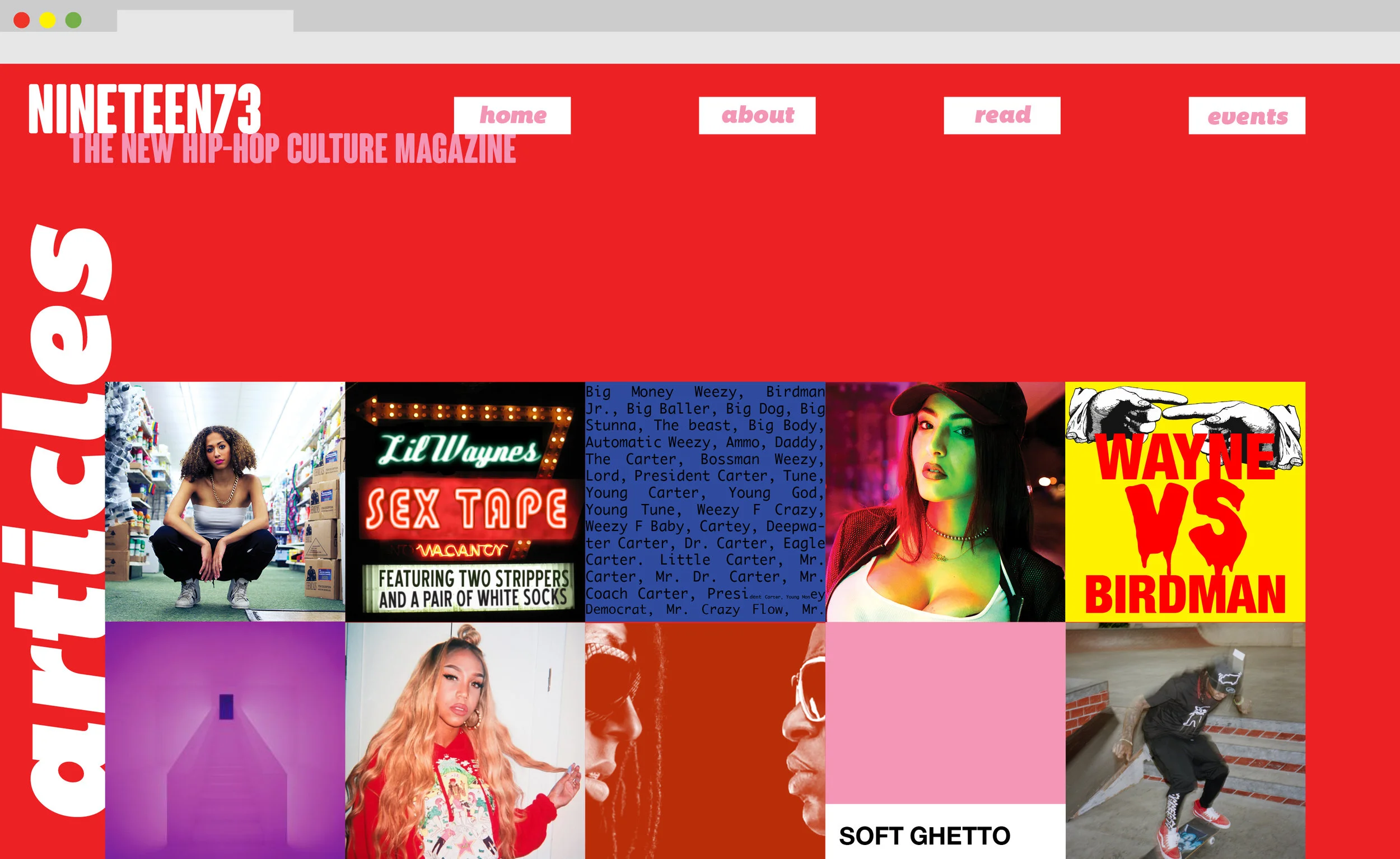 Nineteen73 is a hip-hop based magazine. Each issue highlights a different artist while also including general stories and news articles.